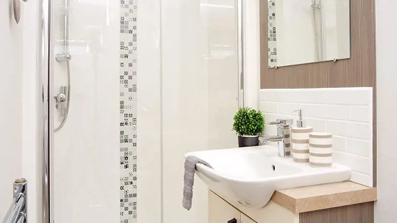 The master bedroom is spacious with a double bed, storage and 14” TV. The twin bedroom comes complete with 2 single beds. There’s a family shower room with a washbasin and WC. Olive Caravans come complete with an outdoor picnic bench.