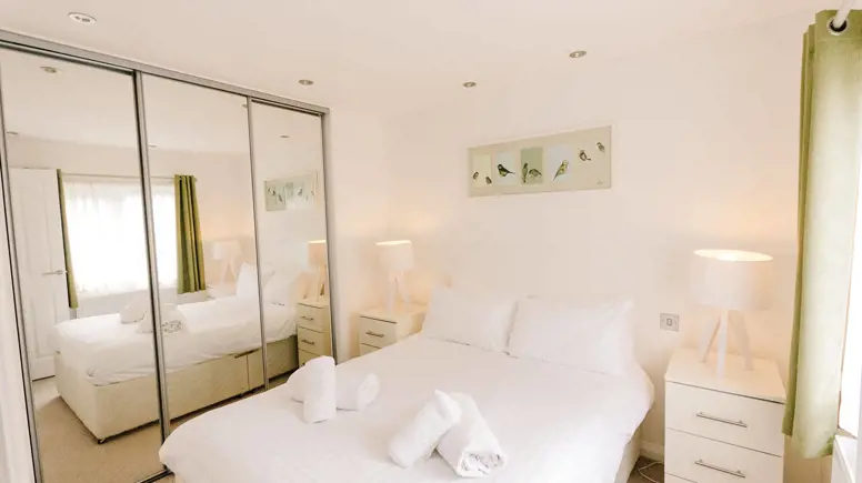 The master bedroom features a king side bed, and a separate door to the main shower room. The second bedroom features bunk beds.