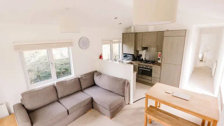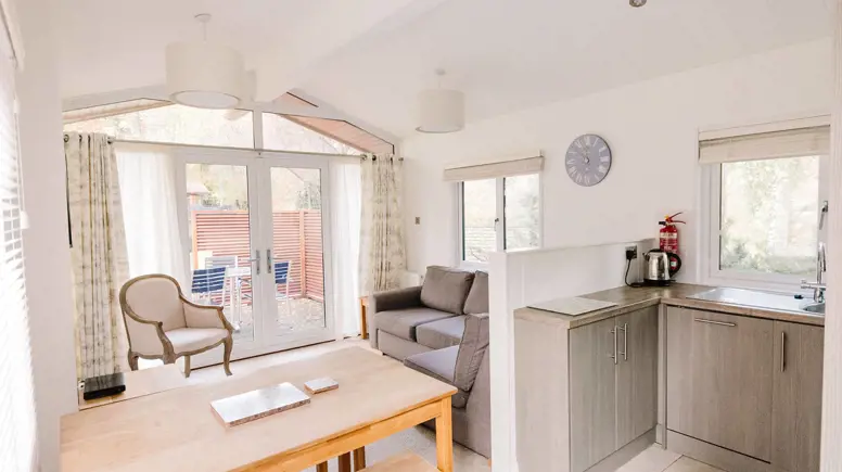 The open plan living area features a Smart TV with surround sound and fully equipped kitchen. It opens out onto the decking area where you’ll find a bistro set, perfect for alfresco dining or relaxing.