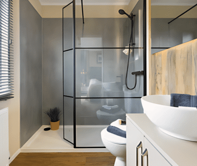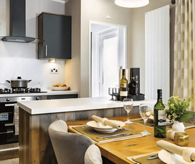 With a generous open-plan layout, the Boston features a large living area complete with plush free-standing furniture, a stylish electric fireplace, and floor-to-ceiling windows that flood the space with natural light. The fully equipped modern kitchen includes integrated appliances, sleek cabinetry, and a convenient breakfast bar – ideal for entertaining or quiet mornings.