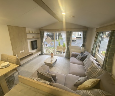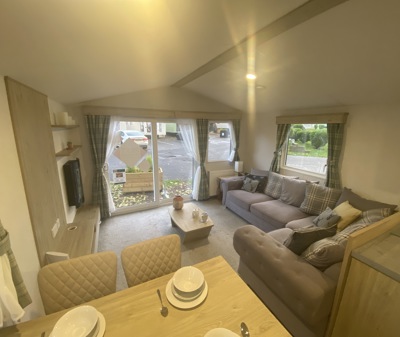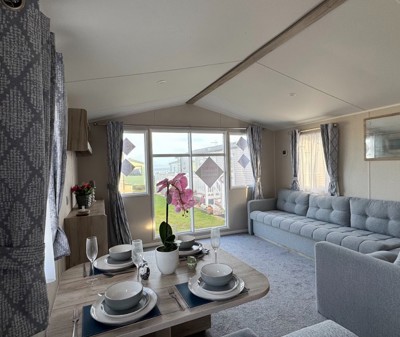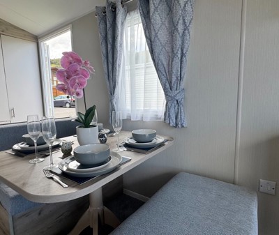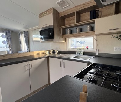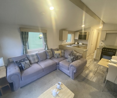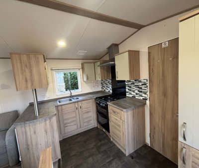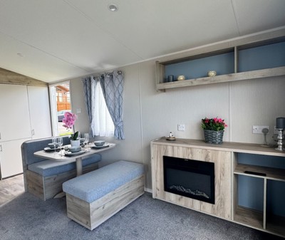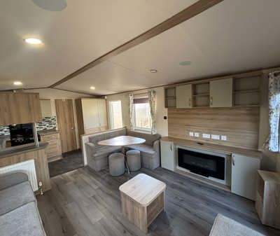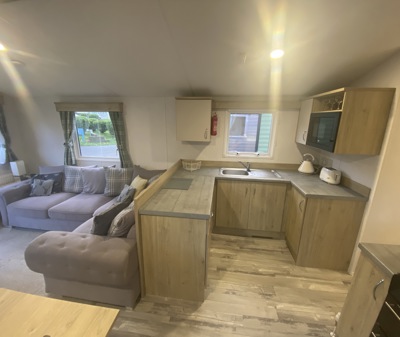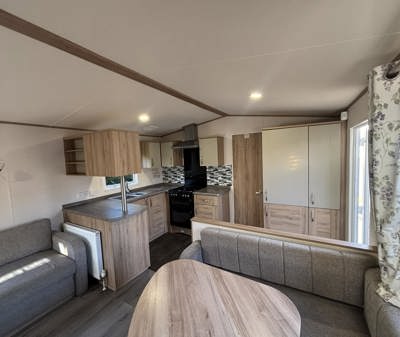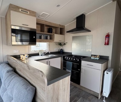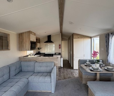 The Abi Oakley is a beautiful pre-loved holiday home offering a warm, welcoming space for relaxing getaways. It features comfortable fixed seating, a dedicated dining area, and a stylish U-shaped kitchen complete with a built-in fridge-freezer and microwave.